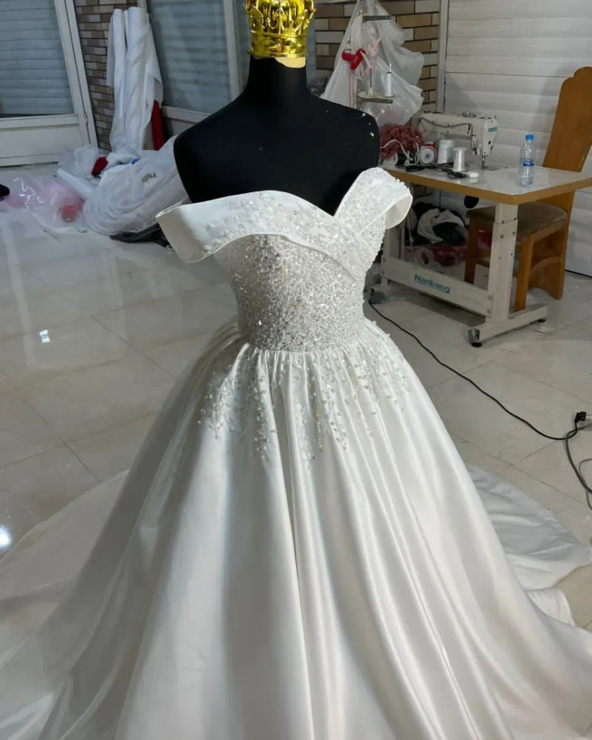 لباس عروس اروپایی افشولدر با تزئینات مروارید