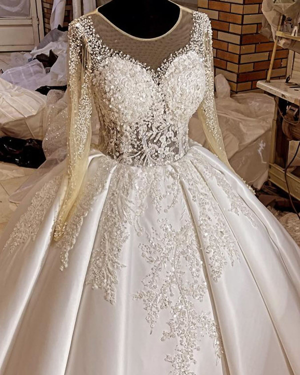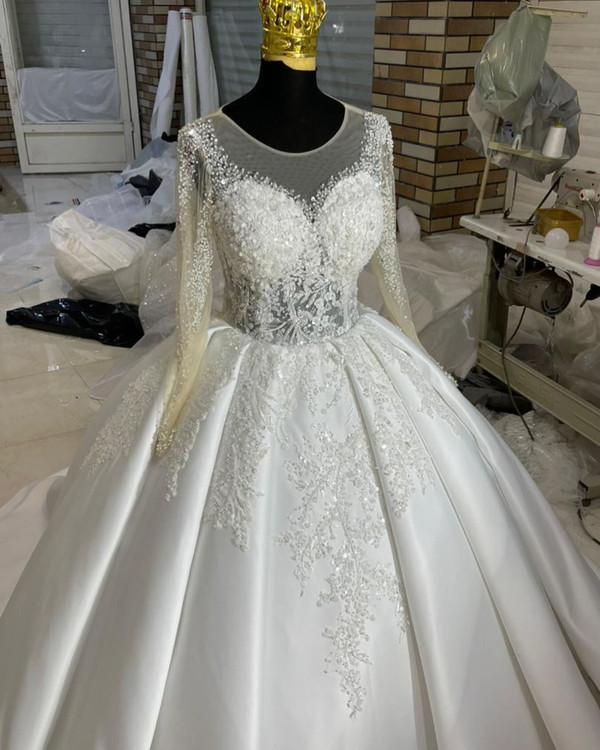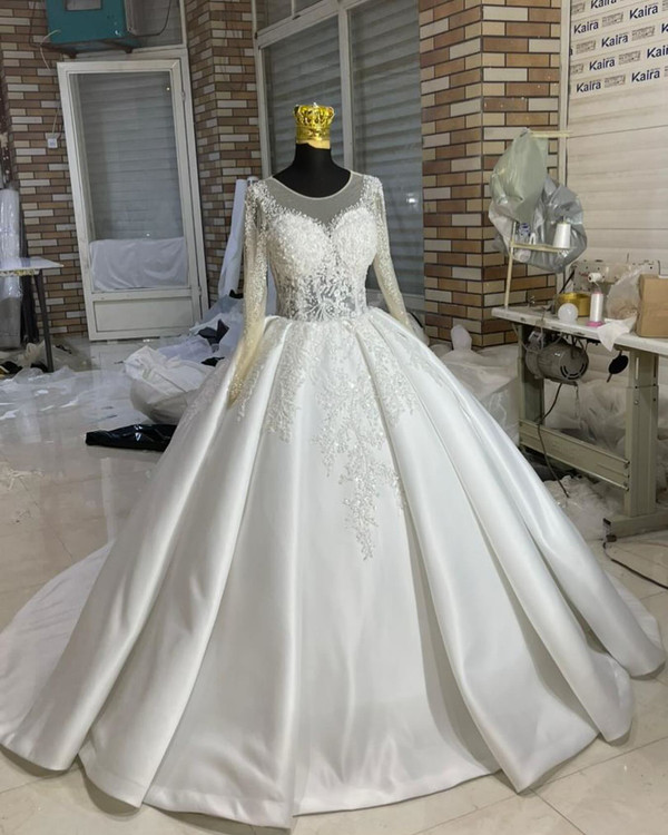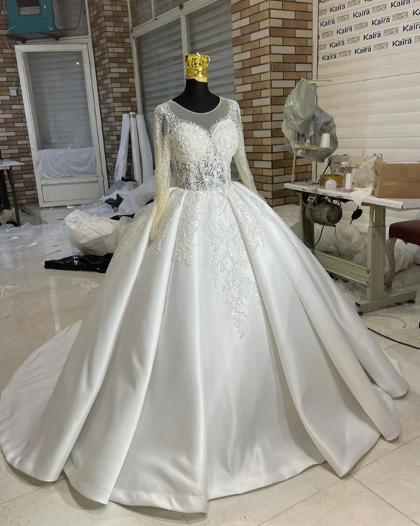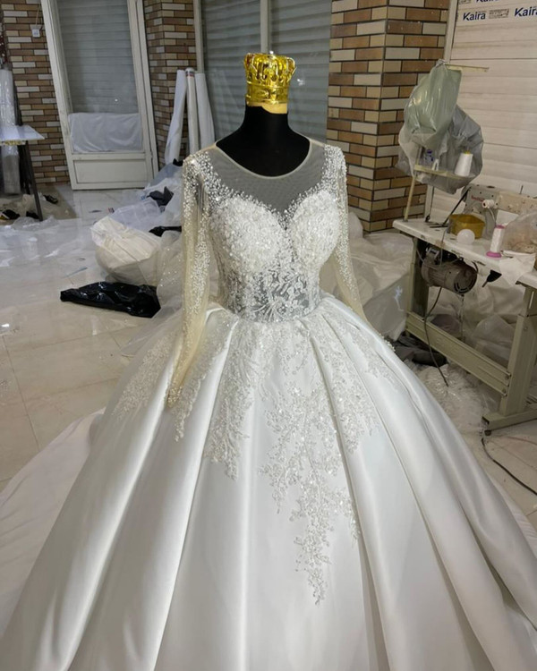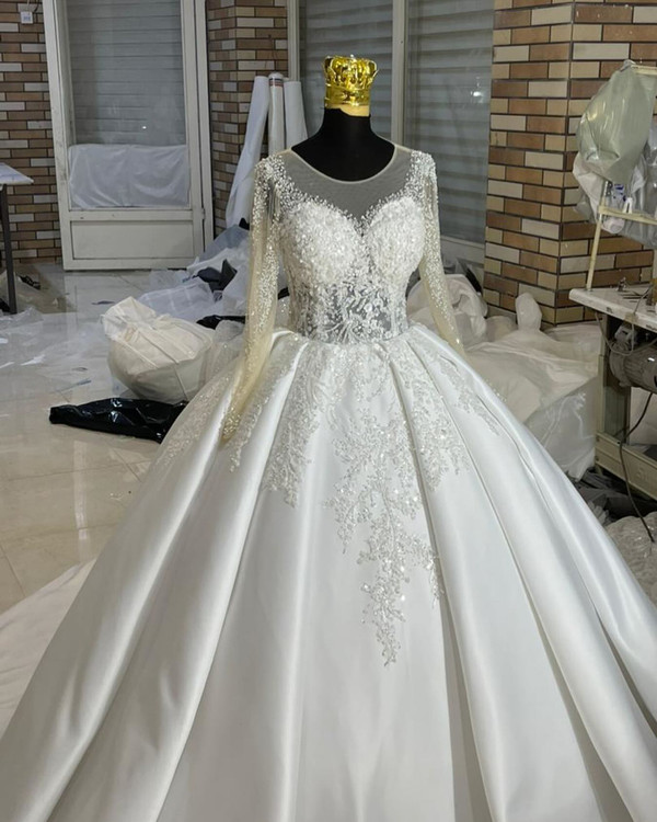 لباس عروس ساتن امریکایی با تزیینات دانتل پرکار و بالاتنه و آستین پرکار این مدل زیبا بالاتنه تاپلکسی بدن نما هست و تزییناتش با یه دانتل بسیار شیک و پرکاره پارچه ساتن امریکایی دو کلوش با زونیکس