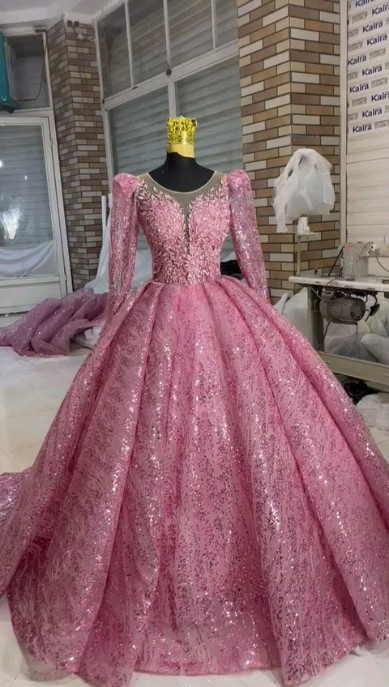 لباس عروس صورتی شاین پفکی با دانتل برگی پرکار این لباس بسیار پرطرفدار و زیبا با شاین صورتی و زیر کار زونیکس دوخت شده و دانتل برجسته تزیین شده قابل سفارش در انواع رنگ و سایز و تعداد