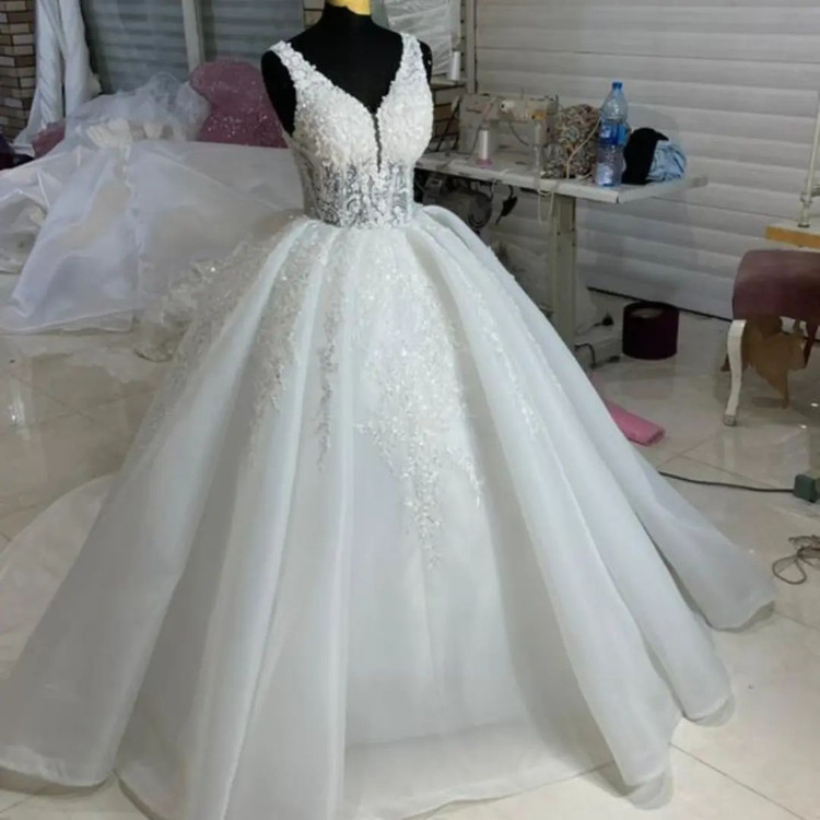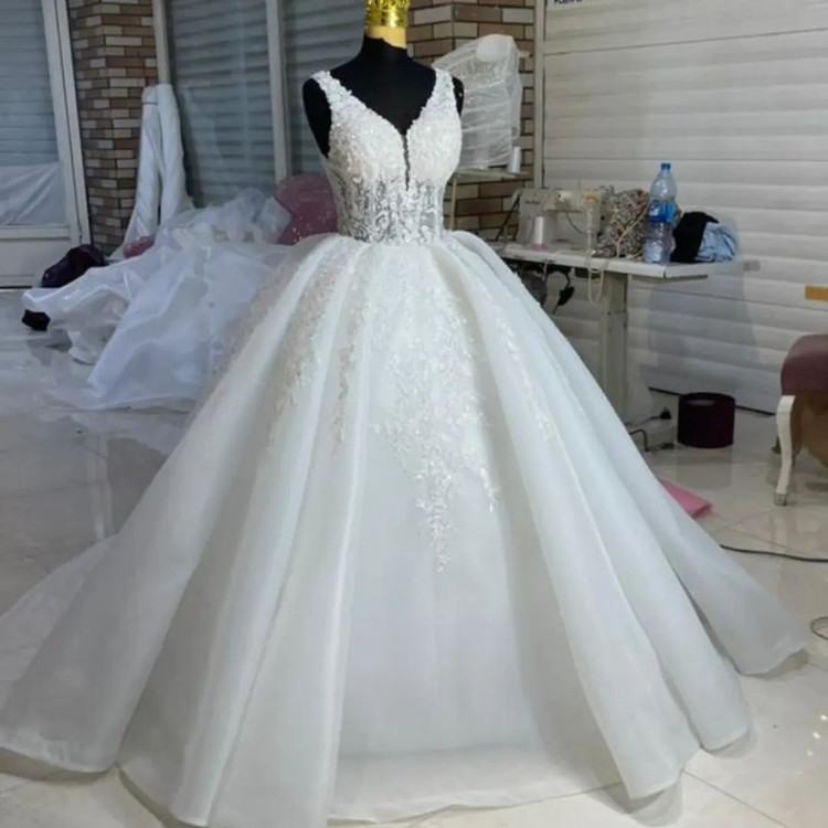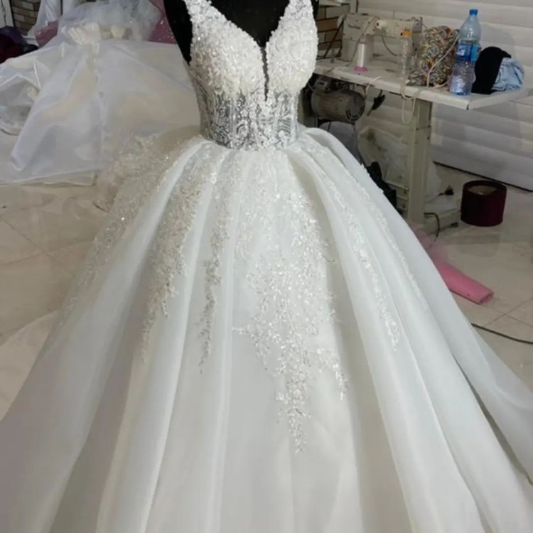 لباس عروس حریر دو کلوش با دانتل پرکار