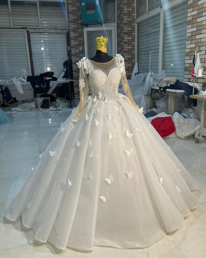 لباس عروس حریر ترک با تزیینات دانتل پروانه و مهره دوزی جفت با پنل و سنگ پرکار کد ۳۰۲ سلام روزتون بخیر این مدل زیبا با پارچه حریر دوخت شده رنگ کاملا سفید هست دانتل پروانه ای تریین شده و بالاتنه مجدد کار دست خورده خیلی پرکار و مجلل و فاخر هست پشت بندی فری سایز قابل اجرا در انواع رنگ و سایز و تعداد از طریق واتساپ و و سایت Lebasaroos.ir