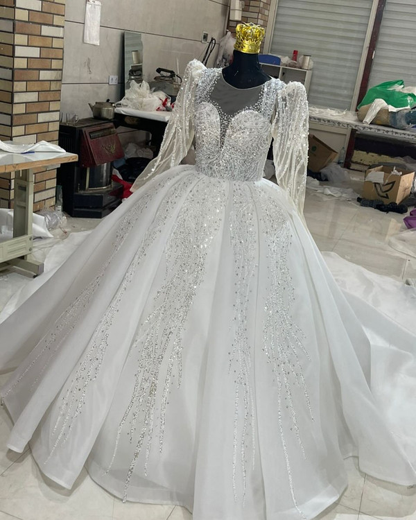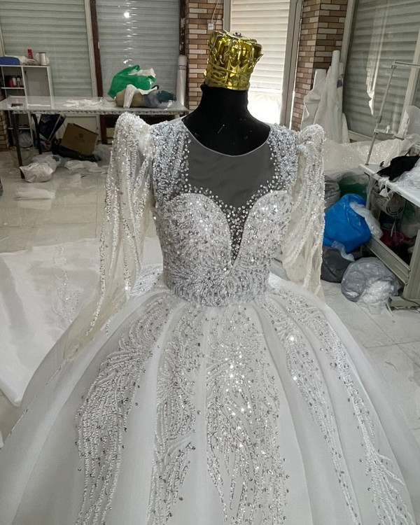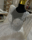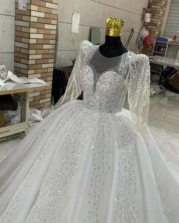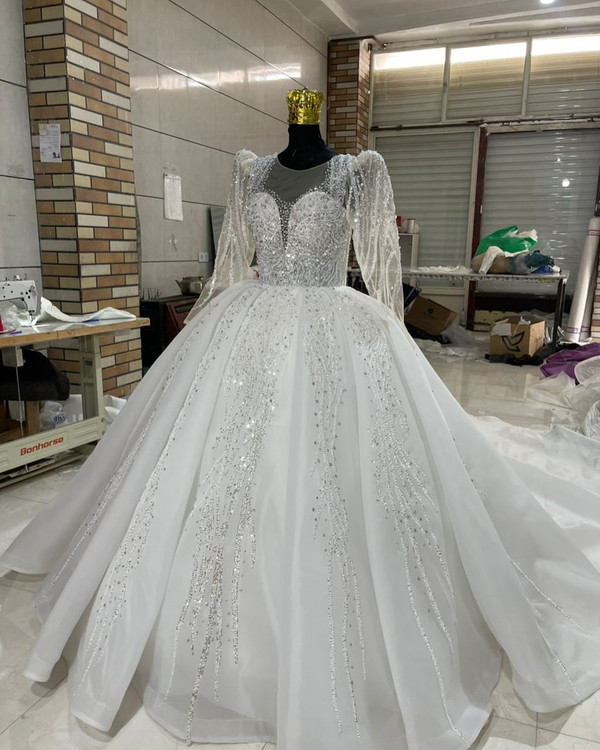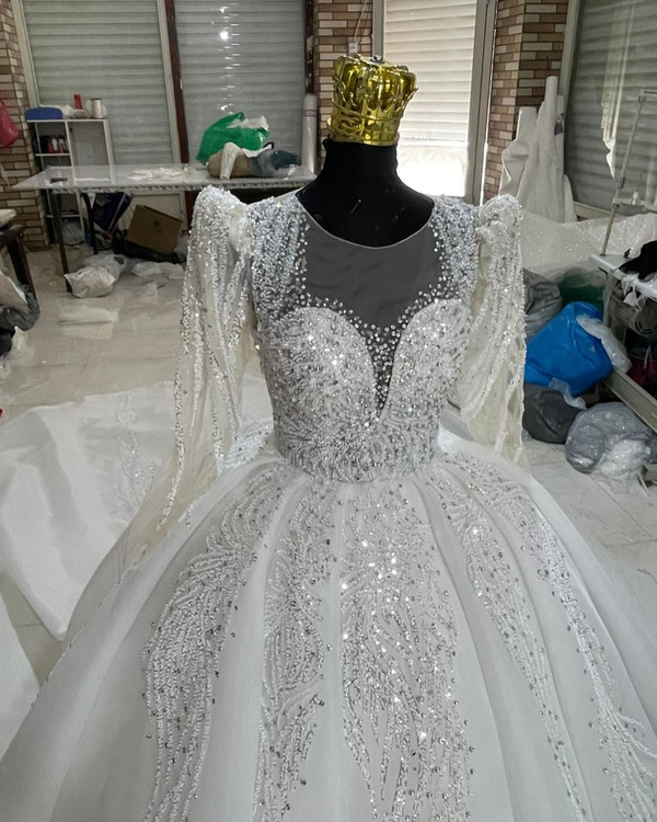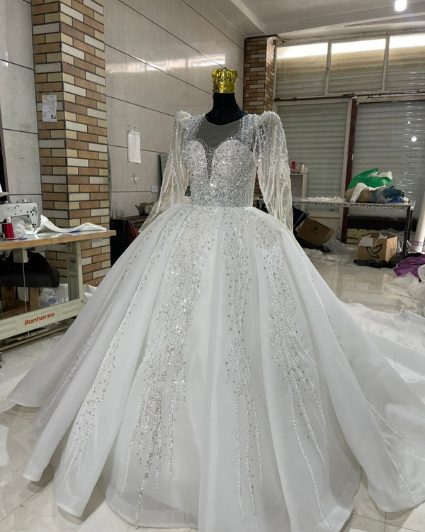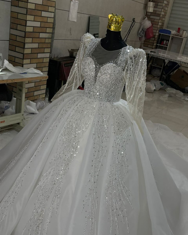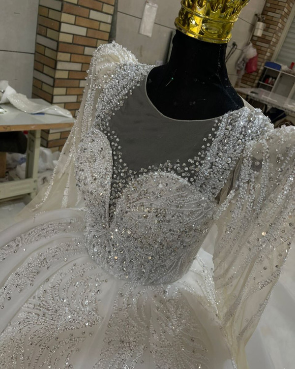 لباس عروس حریر سه کلوش با دانتل پرکار و سنگ کد ۳۶۴