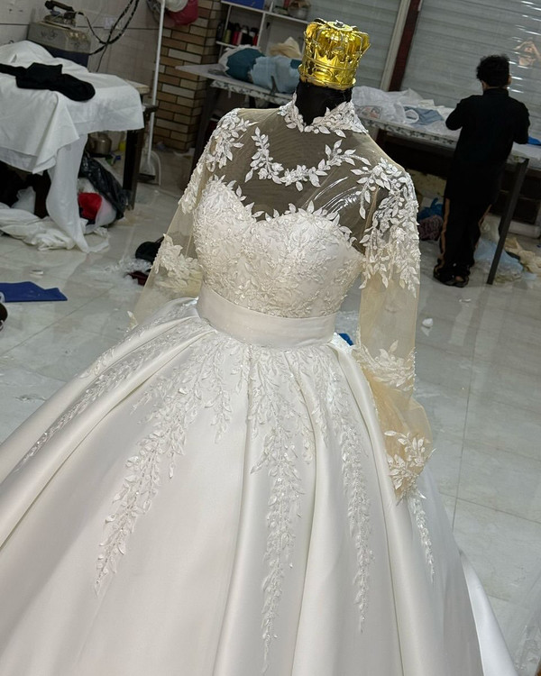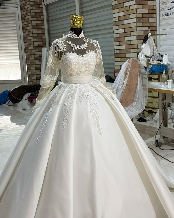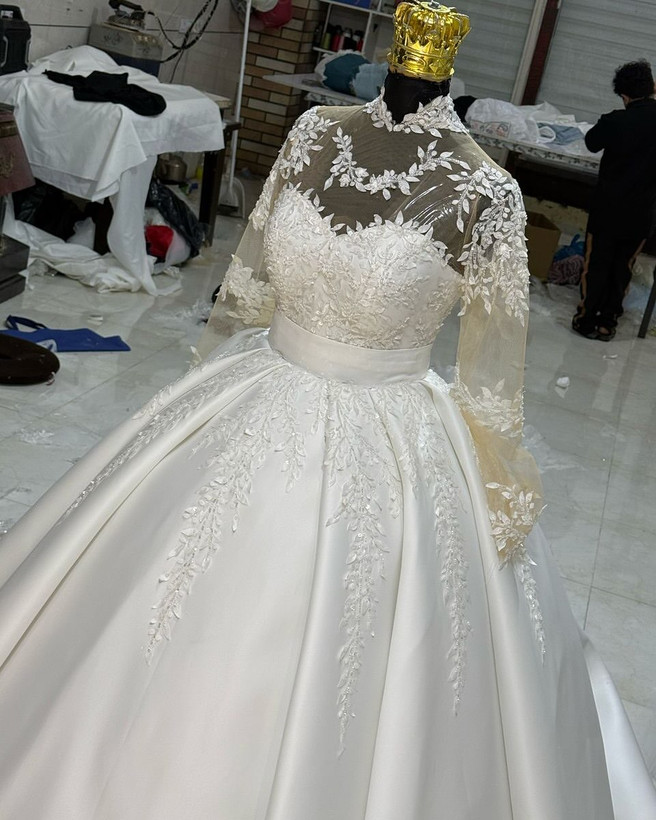 لباس عروس ساتن امریکایی با تزیینات دانتل برگی کد ۳۸۱ سلام وقتتون بخیر این مدل زیبا با پارچه ساتن دوخت شده رنگ کاملا سفید هست بالاتنه و دامن با دانتل تزیین شده تن خور عالی پشت بندی فری سایز قابل اجرا در انواع رنگ و سایز و تعداد سفارش از طریق واتساپ و و سایت Lebasaroos.ir #شاین
