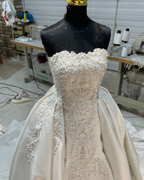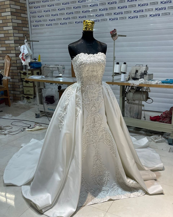 لباس عروس دو دامنه ساتن و حریر و دانتل ترک کد ۳۷۵ سلام وقتتون بخیر این مدل زیبا با پارچه ساتن و حریر دوخت شده رنگ کاملا سفید هست با تزیینات دانتل پرکار تن خور عالی خیلی ترند هست و اروپایی پشت بندی فری سایز قابل اجرا در انواع رنگ و سایز و تعداد از طریق واتساپ و و سایت Lebasaroos.ir