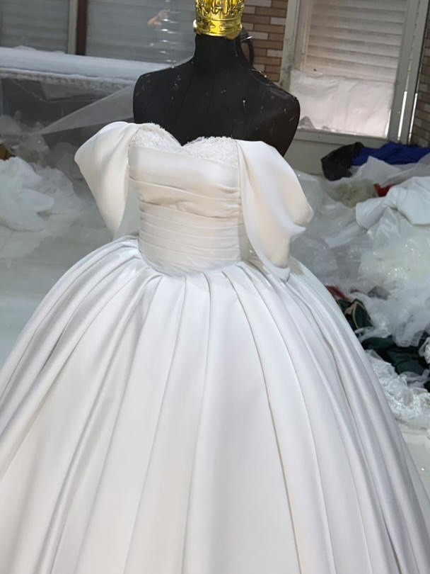 لباس عروس ساتن سه کلوش با تزیین دانتل کد ۴۱۴