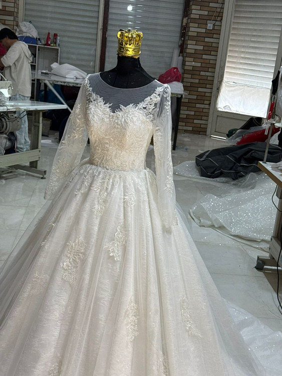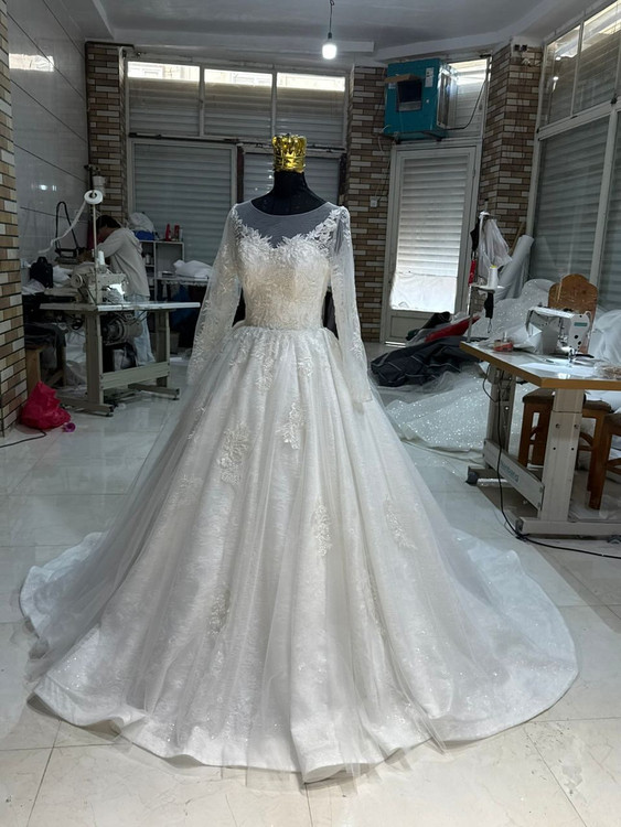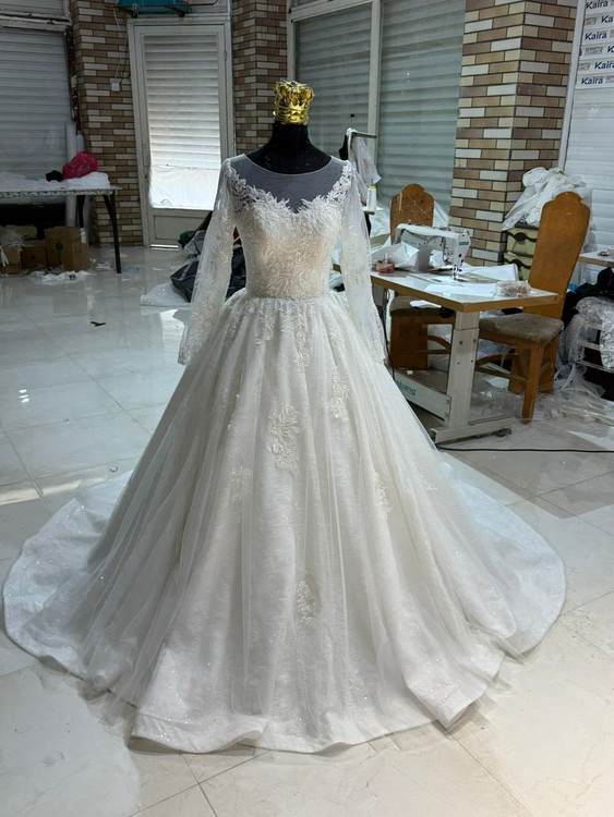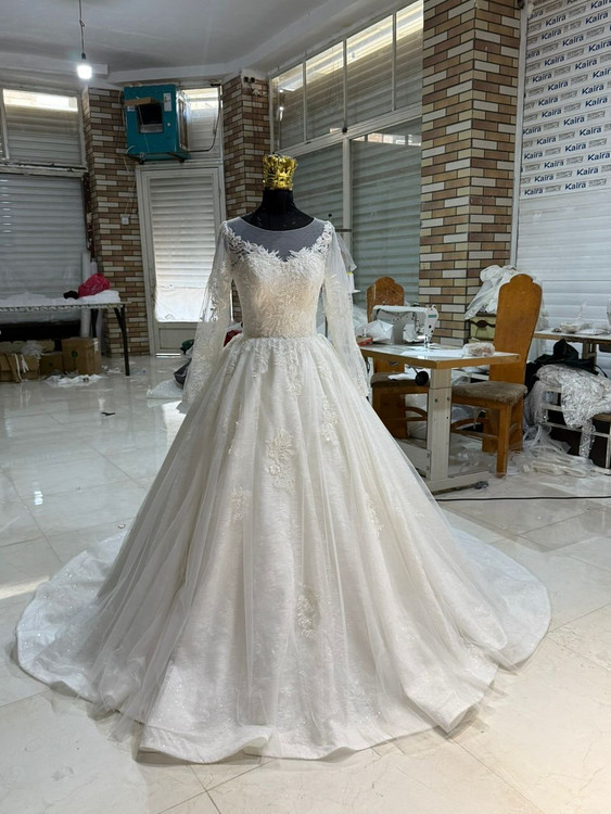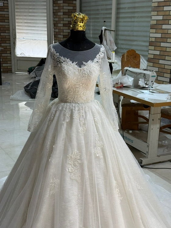 لباس عروس دانتل فرانسه با تزیین دانتل برجسته کد ۴۱۱