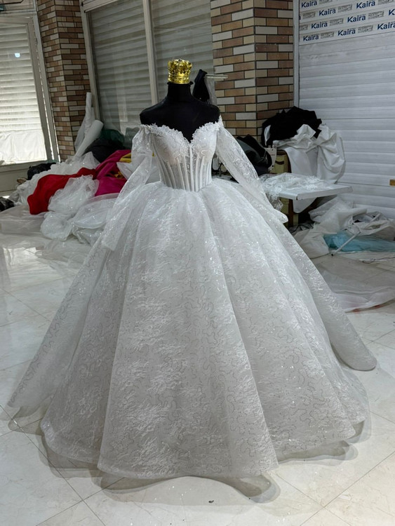 لباس عروس دانتل فرانسه با تزیین دانتل برجسته کد ۴۳۱
