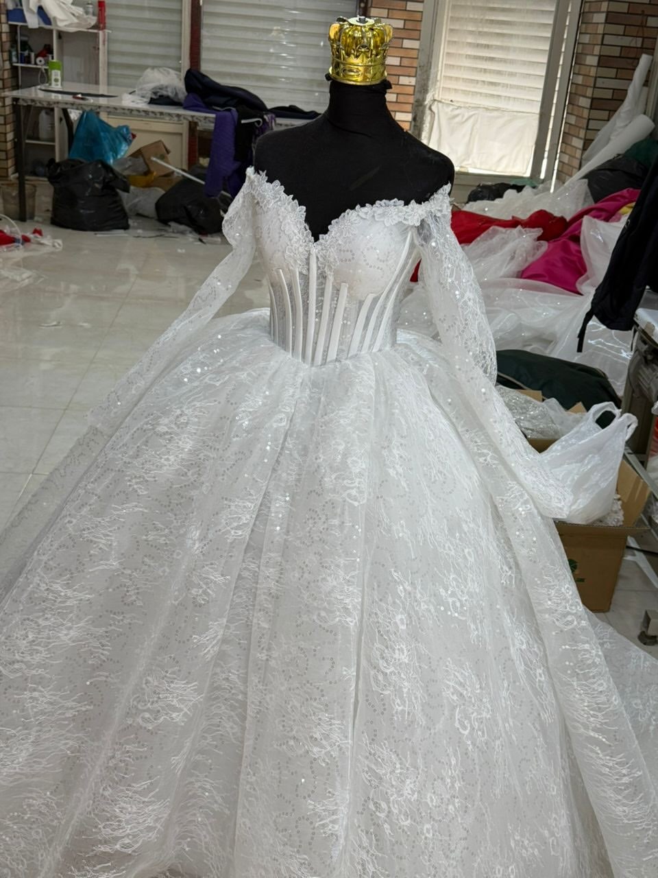 لباس عروس دانتل فرانسه با تزیین دانتل برجسته کد ۴۳۱